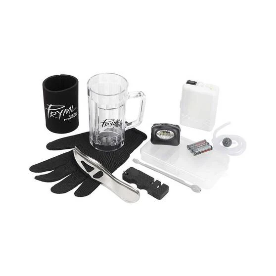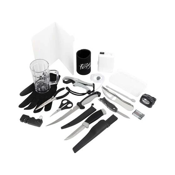 The 17 Piece Fishing Essentials Bucket is packed with tools and accessories for your fishing and even gaming adventures. Prepping bait & line will be easy with a 12-in-1 multitool, 7″ split ring pliers, stainless steel braid scissors and a 4″ bait knife with plastic sheath. Keep your bait fish looking healthy with the 10 litre bucket & the 2 speed aerator (batteries not included). Landing fish will be no problem with the compact mini lip grip, hook remover and 5LED headlamp (batteries not included). Even gutting your catch is easy with the fish scaler, 6″ fillet knife with plastic sheath, filleting glove, folding bait board and plastic knife sharpener. All while sipping your drink from your Pryml drink mug and cooler! What more could you need for a great day out?